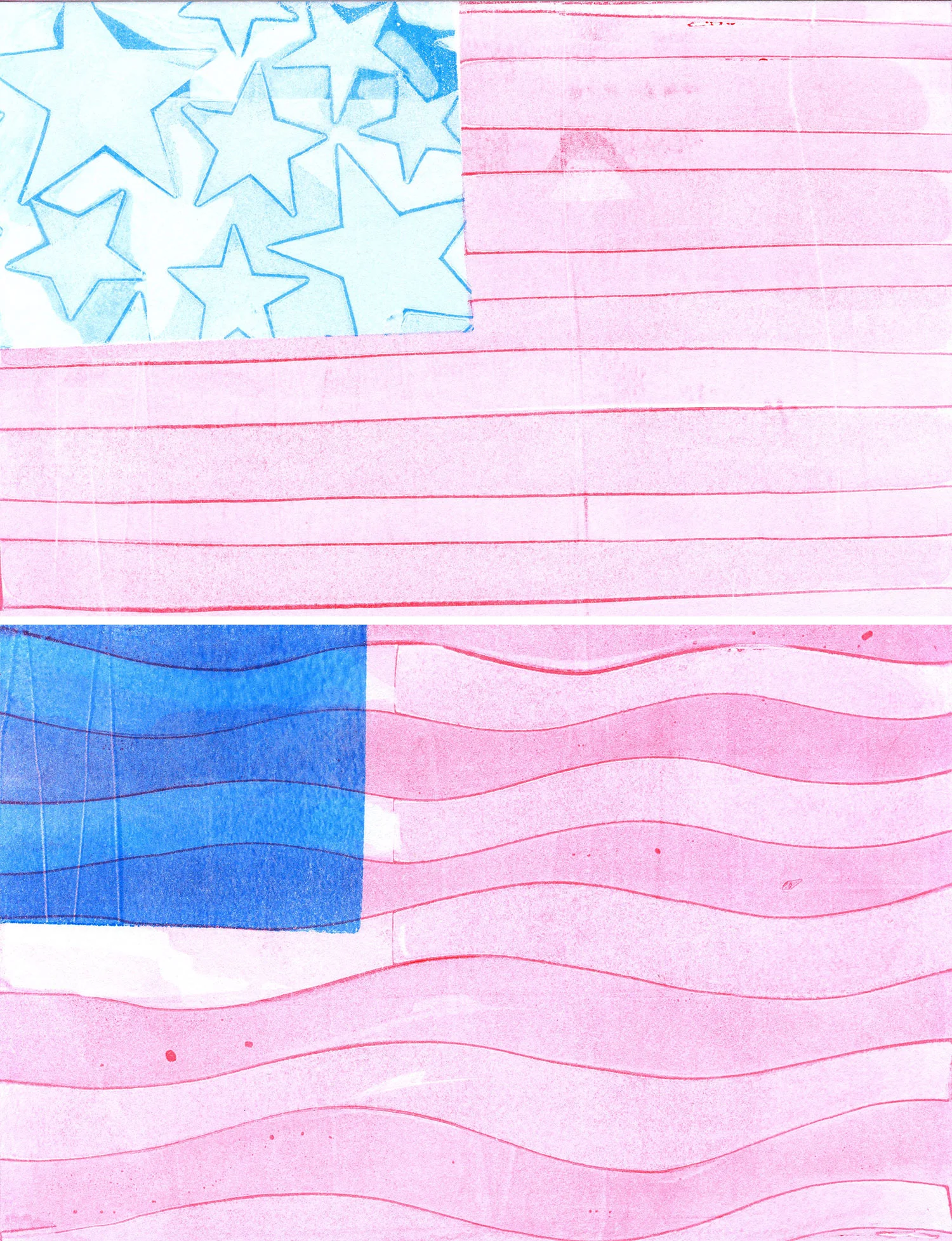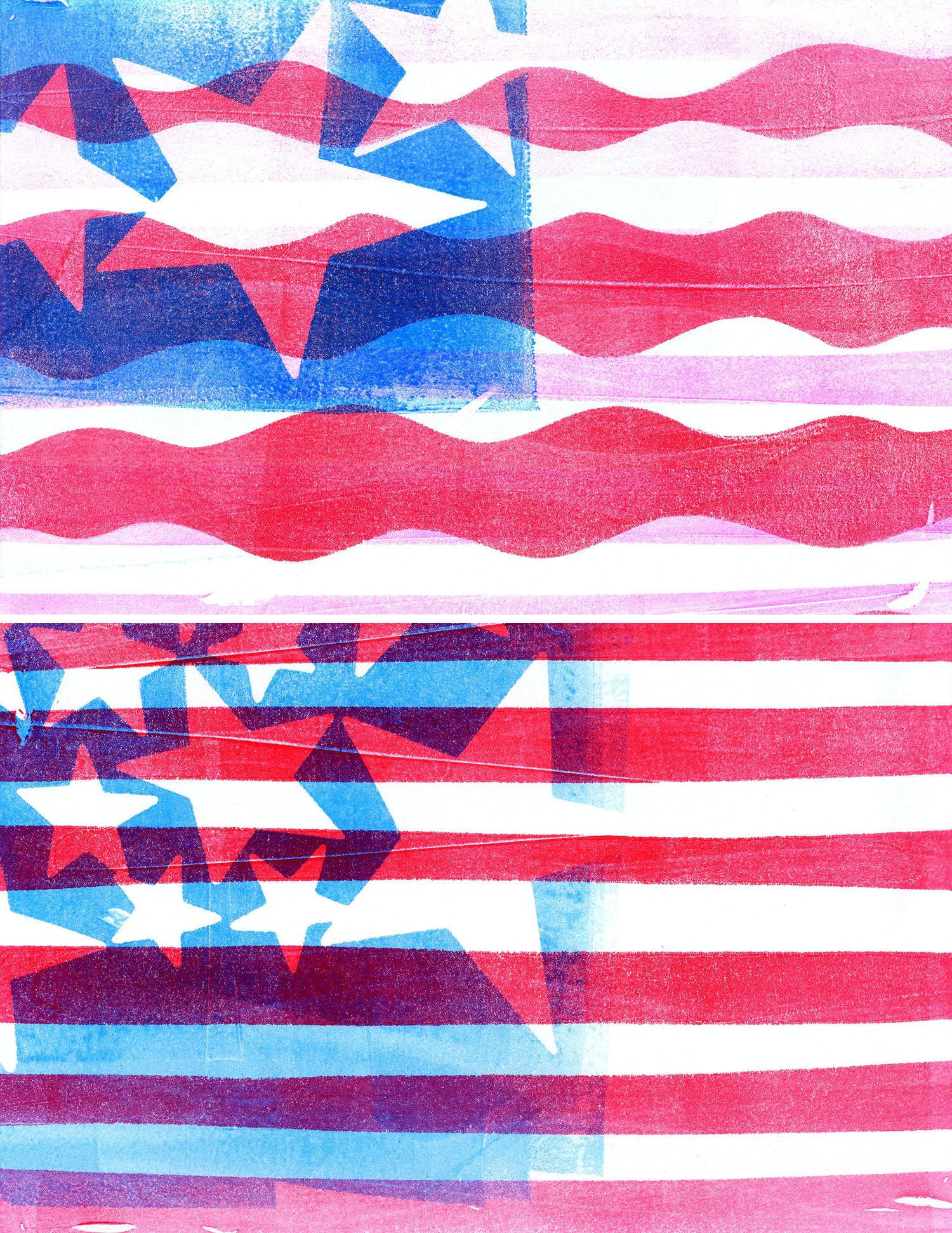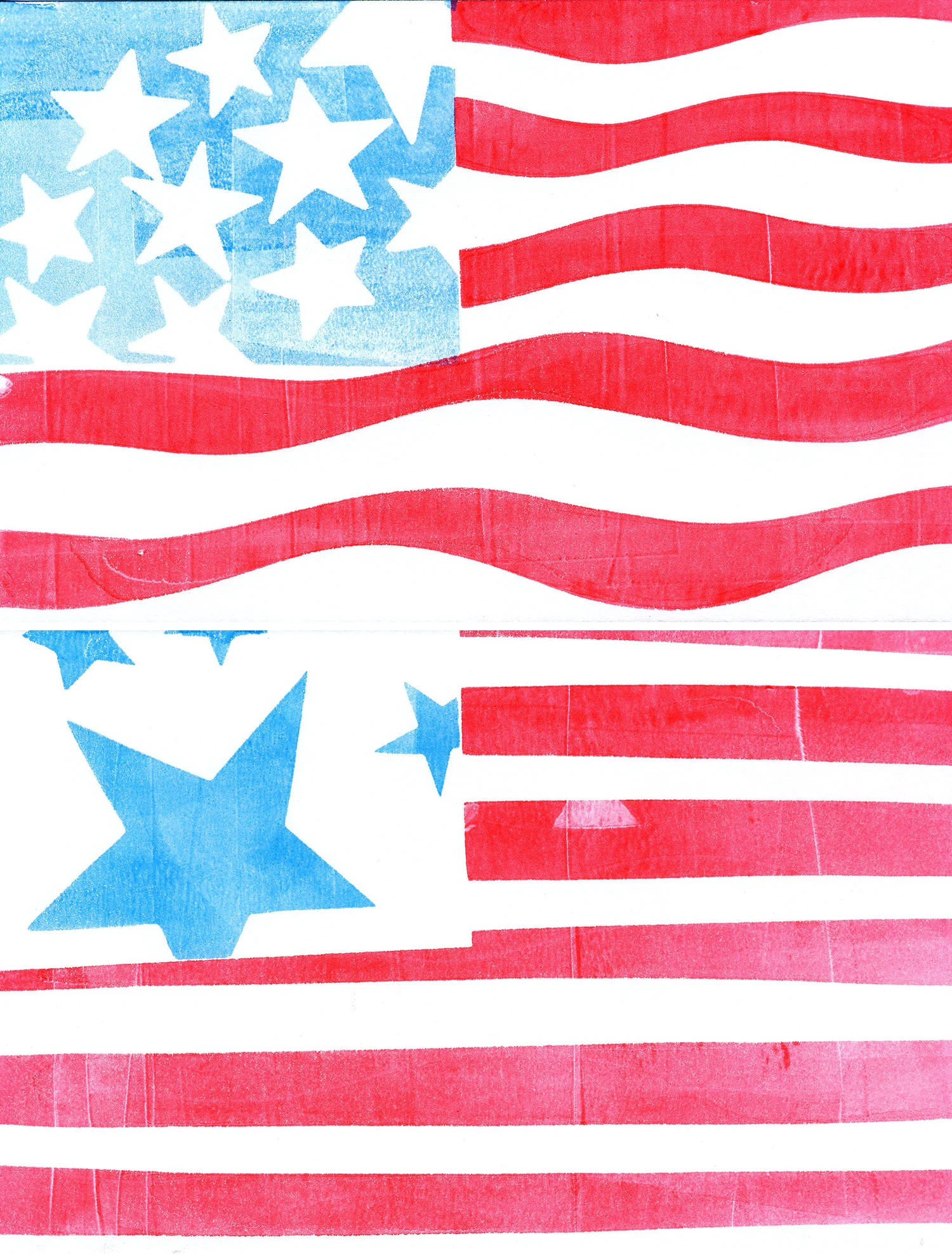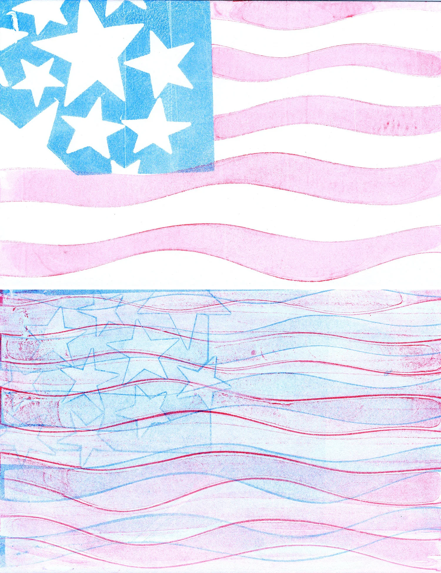 I'm hooked on gelatin printing ever since learning the process from the book Playing with Surface Design. And this time of year I'm always inspired to play with the American flag. As I've explained in a previous post the gelatin is used as a printing base. It is not what is producing the color of the print... though I like to imagine these flags where made with the classic patriotic Jell-o deserts I never had as a kid.