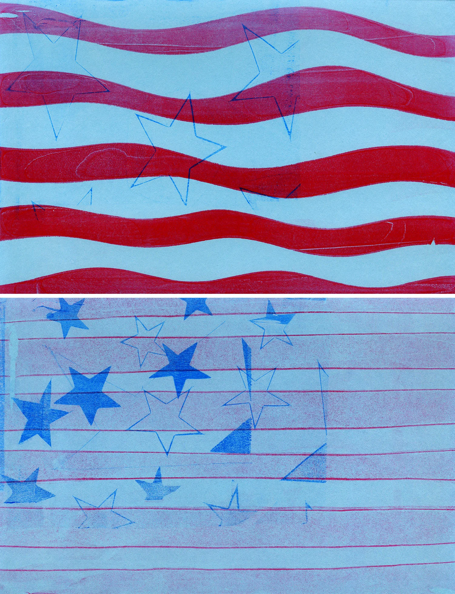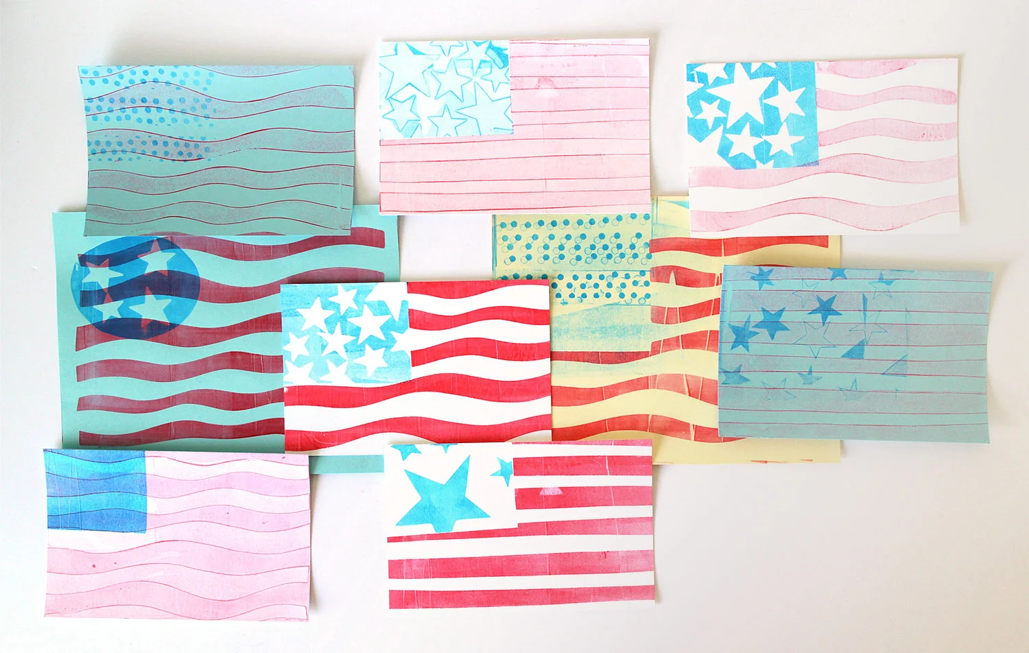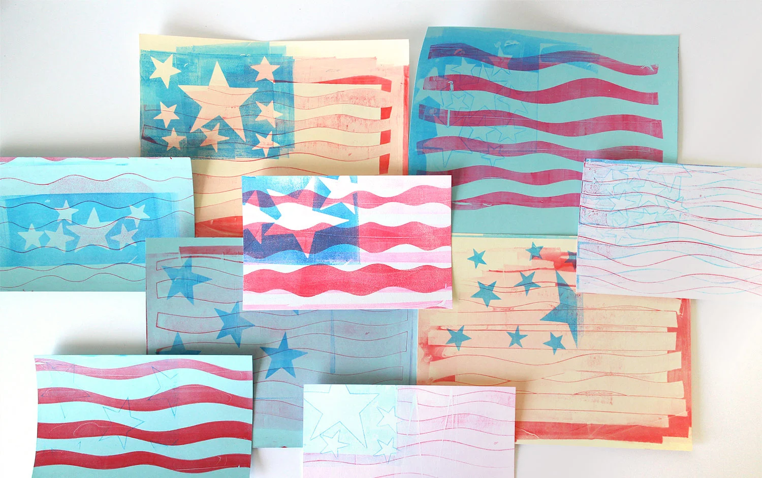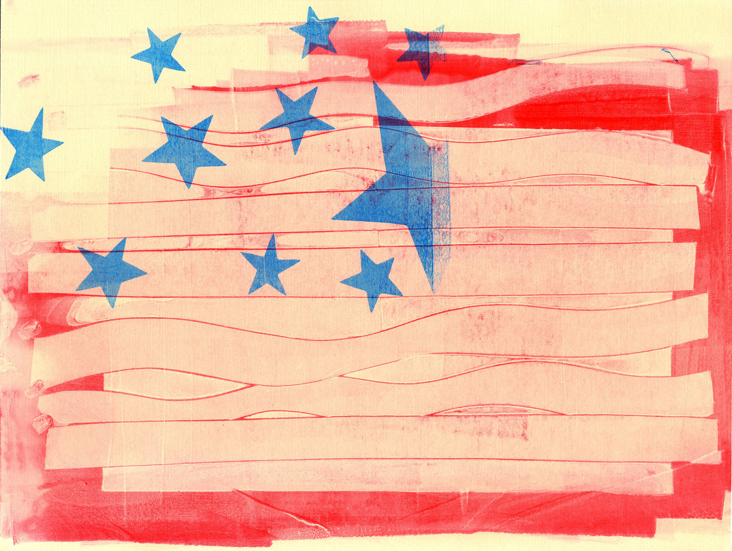 I'm hooked on gelatin printing ever since learning the process from the book Playing with Surface Design. And this time of year I'm always inspired to play with the American flag. As I've explained in a previous post the gelatin is used as a printing base. It is not what is producing the color of the print... though I like to imagine these flags where made with the classic patriotic Jell-o deserts I never had as a kid.